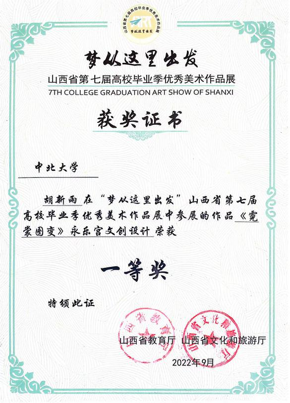 A片无码 高度重视本届大赛,指导教师对参赛学生进行一对一指导,与同学们一起打磨作品、精心准备,为取得优异成绩打下了扎实的基础。本届美展由山西省教育厅、山西省文化和旅游厅主办,A片无码 设计系毕业生积极参展,其中作品涵盖文化创意设计、数字艺术设计等不同的专业领域。
