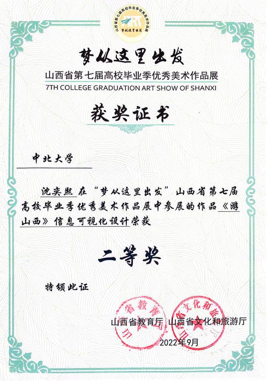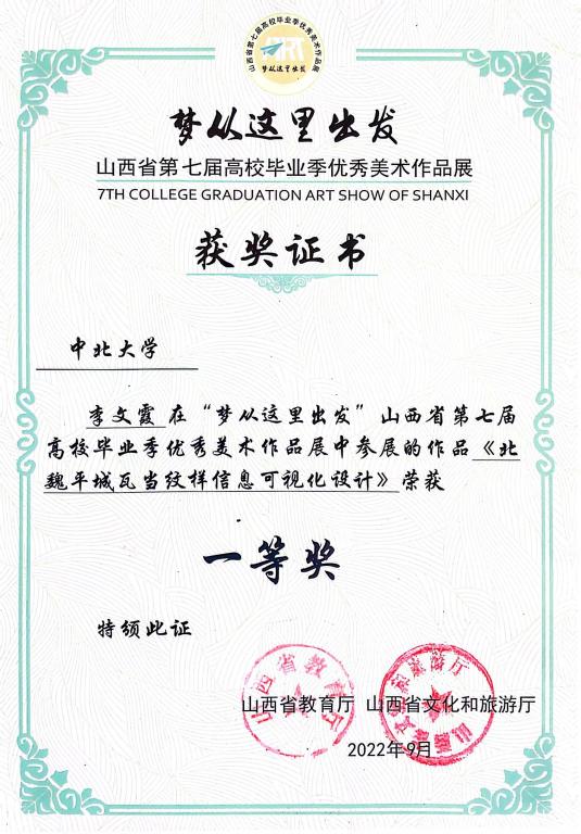 “梦从这里出发”山西省第七届高校毕业季优秀美术作品展于2022年6月10日至7月10日在线上举行。我校获“优秀组织奖”,参赛作品获得30项奖项,其中一等奖3项,二等奖6项,三等奖9项,优秀奖12项,创我校在该项赛事中的最好成绩。