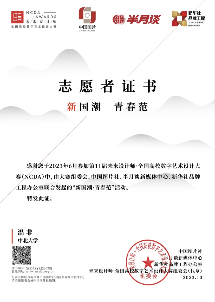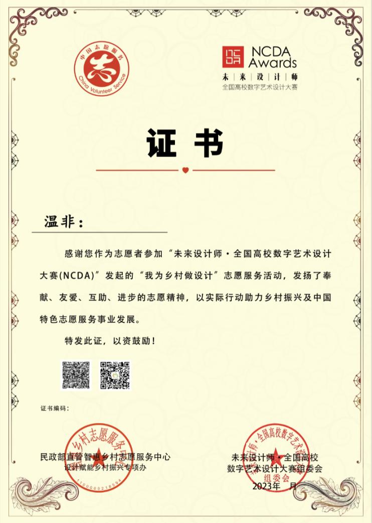 作品设计过程中,温非老师从选题立意、创作思路到作品落地全程指导,展现了高度的专业素养与责任心。针对作品的核心创意,他引导学生跳出传统思维框架,将传统元素、现代数字技术与乡村振兴、文化传承深度结合,帮助学生精准把握赛事评审标准与时代审美需求,最终让作品在众多参赛佳作中形成独特风格,荣获佳绩。