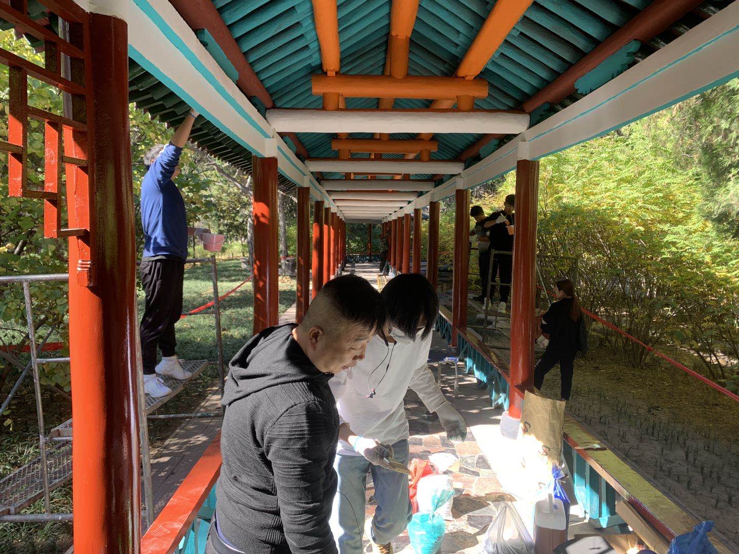 申旭栋老师负责,组织二十余名学生加班加点、精心描绘,用时13天时间将77米长廊全部彩绘完成,长廊彩绘效果整体简洁大方,枋粱上绘有山水、花鸟、风景图案,其线条细腻、形象逼真,极大地改善了长廊整体面貌,提高了柏林园整体美观效果,更好地为我校师生提供了学习、休闲、娱乐的好去处,为迎接我校80周年校庆和实现“百年百强”中北梦做出积极贡献。