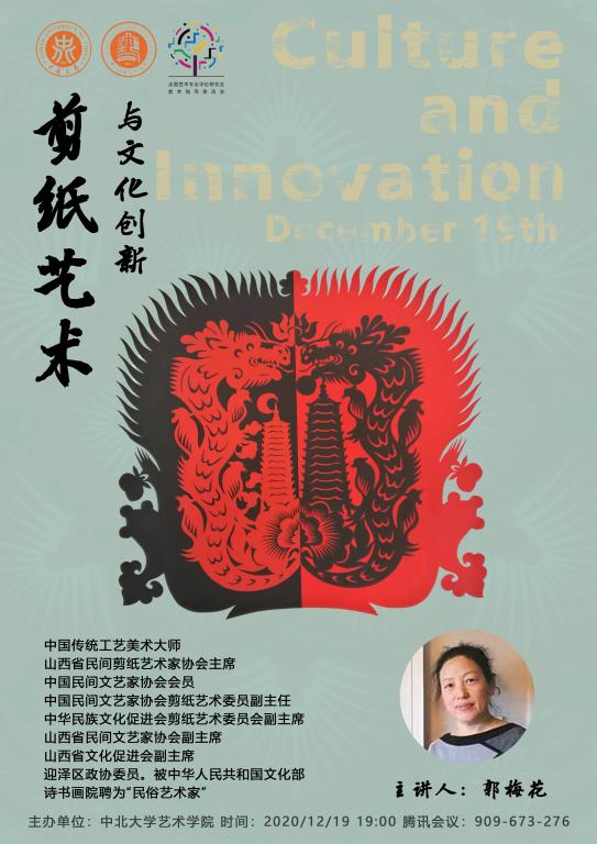 举办了《剪纸艺术与文化创新》线上专题讲座。讲座中,郭梅花老师向我们分享了从八十年代至今的系列作品构思及创作过程。以“山西面食”为主题的剪纸艺术创作、以“十二生肖”为主题的多色拼贴风格剪纸创作、以“农民生活”为主题的黑白拼贴艺术剪纸等艺术作品。