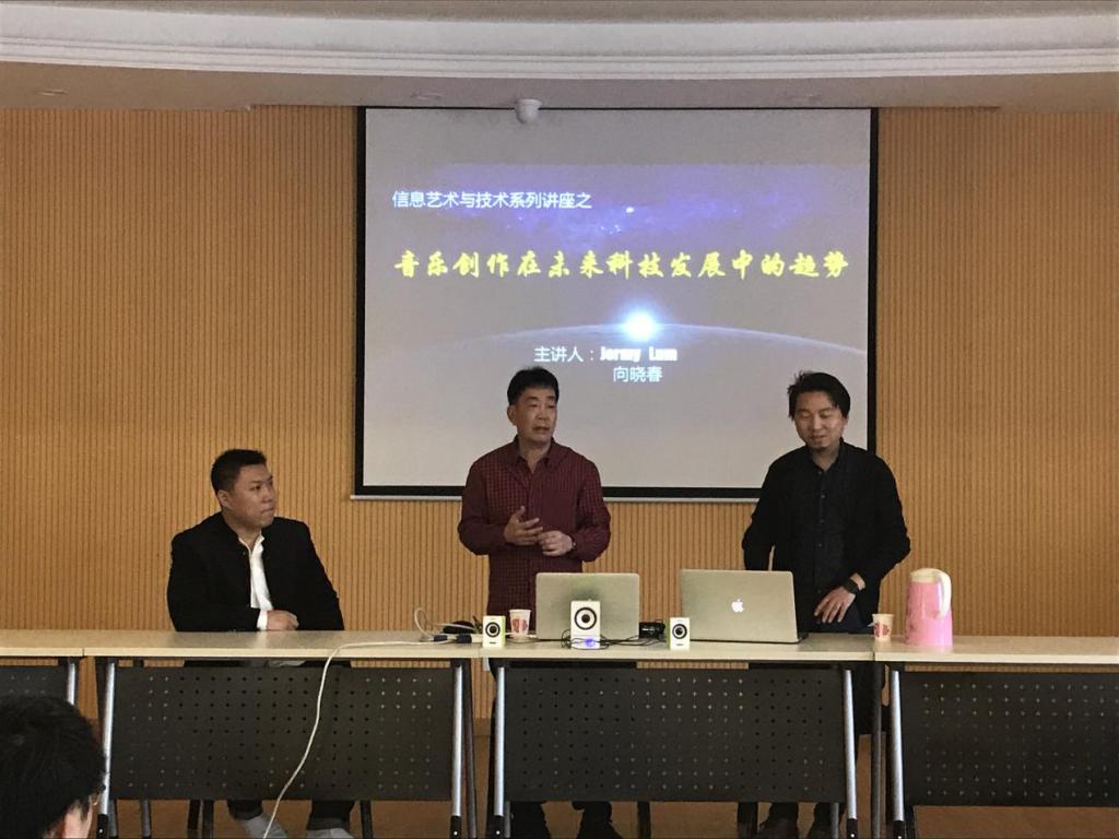 的音乐人向晓春。Jemmy作为新加坡先锋乐派代表人物,在华人乐坛及东南亚极具影响力,曾制作张艺谋导演的电影《英雄》的预告片音乐制作,与港台多位知名艺人合作创作出众多经典音乐。Jemmy通过分享创作经验,讲述了目前东南亚、好莱坞运用的现代音乐创作手法、音乐科技发展趋势;音乐人向晓春主要谈到如何运用作曲技术创作电子音乐,展示了个人创作的部分音乐作品。讲座后,两位音乐制作人解答了在场同学关于电子音乐制作的疑问。