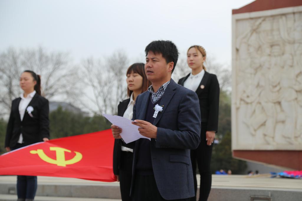 扫墓开始,曹凤才书记和田维飞副书记向人民英雄们敬献花篮,随后由赵朝阳同学带领全体党员在革命英雄纪念碑前举行了宣誓仪式。学生代表杜莎莎同学也做了发言,最后曹书记做了重要讲话,他要求大家:要牢记使命,从现在开始,从一点一滴做起,继承爱国传统,做中华民族伟大复兴事业的开拓者;培育和践行社会主义核心价值观,继承革命先烈精神。宣誓仪式结束后,全体党员一起参观了牛陀寨太原解放纪念馆,瞻仰革命先烈英雄事迹,擦洗革命先烈墓碑等活动。