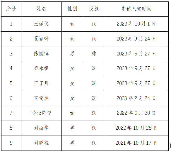 为发扬民主,广泛听取党内外群众意见,接受广大党员群众监督,现将王焮仪等9位同志的情况予以公示,公示期限为5个工作日,自2024年10月8日至10月14日止。如有异议,可在公示期内向本支部反映。反映问题应实事求是、客观公正。以个人名义反映问题时,要签署本人真实姓名。党支部将对反映人和反映问题严格保密。