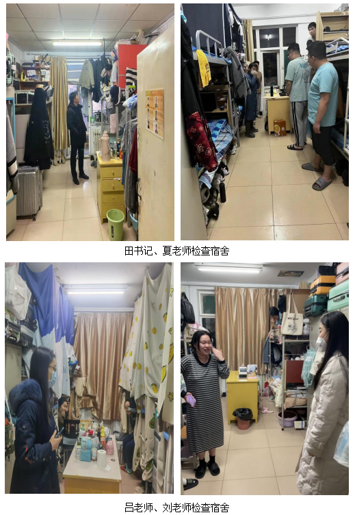 本次检查重点是学生晚归、夜不归宿、未经批准在外住宿、宿舍内违规使用大功率电器、饲养宠物、开窗通风、杂物堆放等其他具有宿舍安全现象进行检查和督促整改。在检查过程中老师们对于出现的问题进行了指正,提醒同学们保持整洁的宿舍卫生环境,同时检查了洗漱用品、日常生活物品的摆放,查看了屋内电线电路,宿舍值日制度等。询问了宿舍同学关于安全用电、防盗防骗防火等日常宿舍生活中需要掌握的基本知识、防范基本技能等问题,并对发现的问题及时给予指正,争取做到发现问题并解决问题,消除细微的安全隐患。