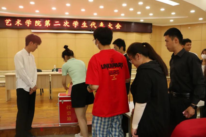 开幕式结束后,进行了学代会第四项,主持人向学生代表介绍了本次推选校学代会候选人员名单及选举注意事项,本次选举以无记名投票方式进行,学生代表依次有序进行投票,工作人员进行监票。投票结束后由工作人员现场进行票数统计,最终有效票数和投票流程符合要求,经大会一致投票,选出八名学生代表及两名主席团候选人,大会最后一项,在嘹亮的共青团团歌声中,本次大会胜利闭幕。